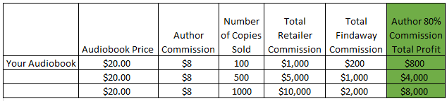 The good news is that Findaway Voices allows you to set your own price. In the example above, I’ve set the price of the audiobook at $20. The retailer takes 50% of that ($10) first, then Findaway Voices takes 20% of what’s left ($2). Finally, the author is left with the remainder ($8).